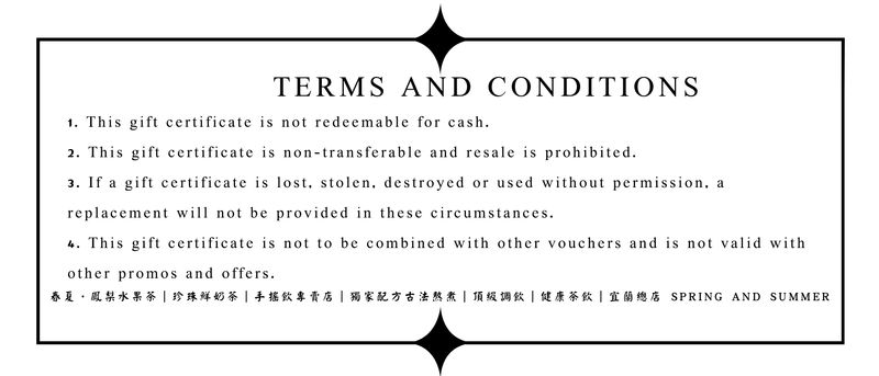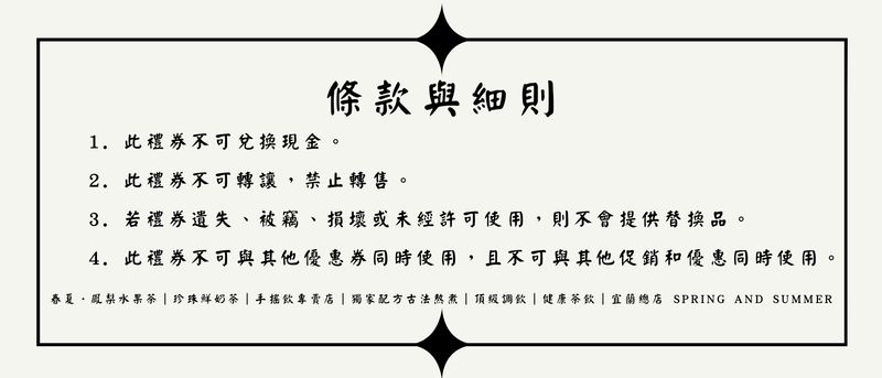 1.入住民宿旅客即可享有飲品折價卷 2. 此禮券不可兌換現金。 3. 此禮券不可轉讓,禁止轉售。 4. 若禮券遺失、被竊、損壞或未經許可使用,則不會提供替換品。 5. 此禮券不可與其他優惠券同時使用,且不可與其他促銷和優惠同時使用。